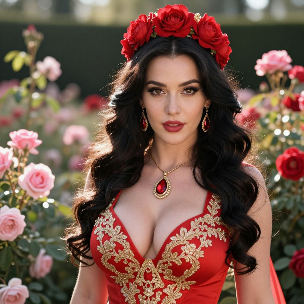 A stunning woman poses gracefully in a lush garden filled with blooming roses. She wears an elegant red dress adorned with intricate gold embroidery, complemented by matching ruby jewelry and a crown of red roses, creating a regal and romantic aesthetic.