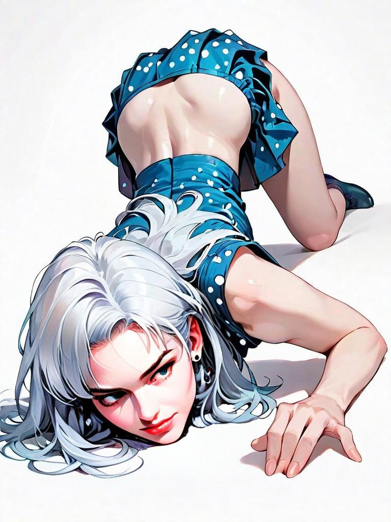 This digital artwork features a strikingly realistic illustration of a woman with silver hair in a dynamic pose, wearing a blue polka dot outfit. The image highlights detailed shading and anatomy with a blend of comic and realism styles, showcasing full-body character design in an eye-catching and expressive manner.