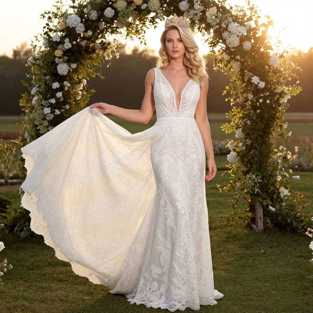A stunning woman in a detailed lace white wedding dress poses elegantly outdoors, holding out the flowing train of her gown. She stands beneath a floral arch bathed in soft golden light, creating a romantic and enchanting atmosphere.