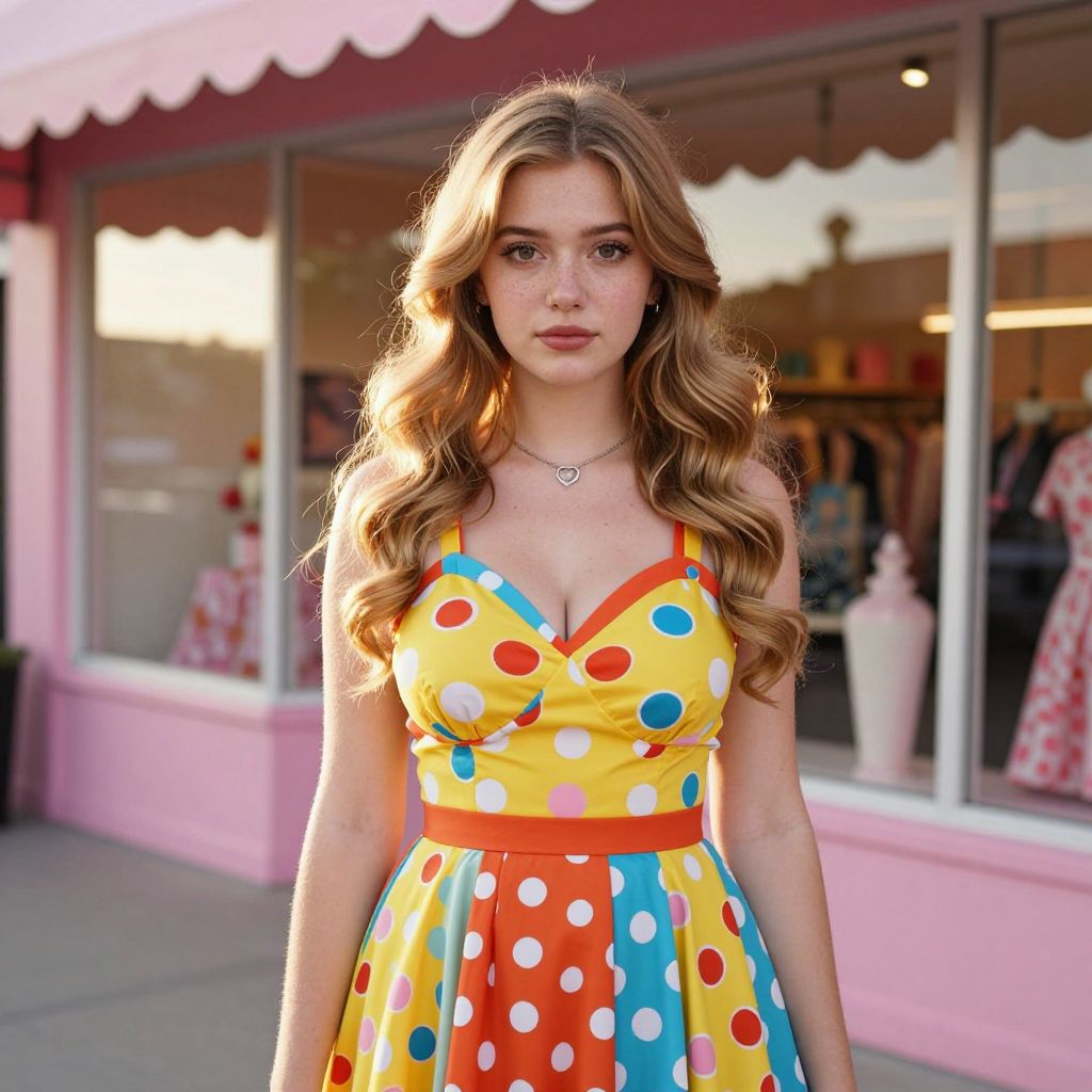 A young woman stands confidently in front of a colorful storefront, wearing a vibrant polka-dot dress in shades of yellow, orange, and blue. Her long, wavy blonde hair and natural makeup highlight her serene expression in this bright, stylish street portrait.