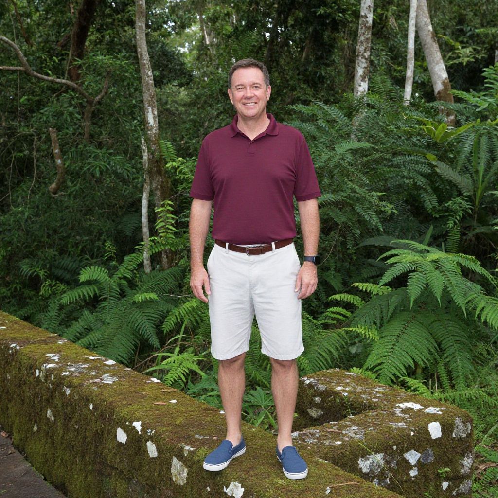 A man wearing a maroon polo shirt and white shorts stands on a moss-covered stone structure surrounded by lush green foliage in a forest setting. He smiles warmly at the camera, showcasing a casual and relaxed demeanor in the natural outdoor environment.
