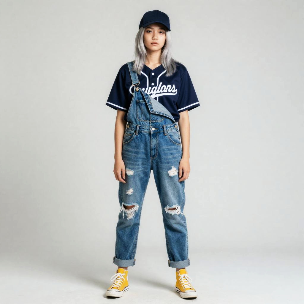 Gen Z Fashion Style with Distressed Denim Overalls and Baseball Shirt