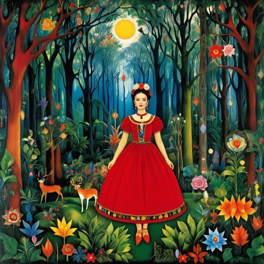 A vibrant and colorful illustration featuring a woman in a striking red dress standing amidst a lush, fantastical forest. The artwork showcases an enchanting natural setting, filled with vibrant flowers and playful deer, reflecting a magical and whimsical atmosphere. This piece exhibits a rich palette and intricate details, characteristic of folk art styles.