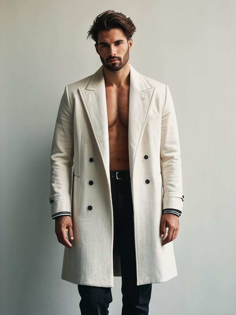 A stylish man poses confidently in a modern fashion ensemble, featuring a cream-colored double-breasted coat worn open to reveal a bare chest, paired with black trousers. The minimalistic background highlights the sharp tailoring and contemporary elegance suitable for a fashion event.