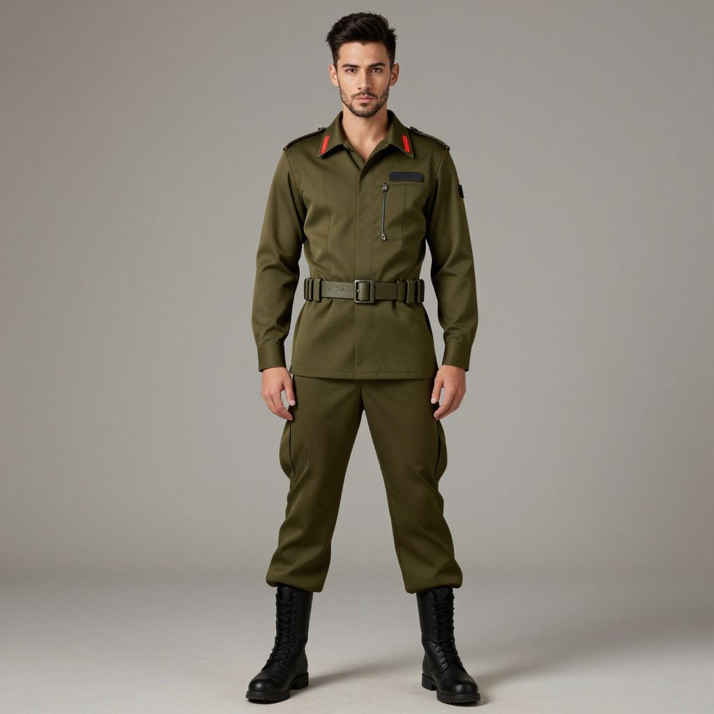 A confident man stands facing forward wearing a neatly tailored olive green military-style uniform featuring red insignias on the collar, a wide belt, and black combat boots. The clean, minimalist background highlights the formal and structured design of the outfit.
