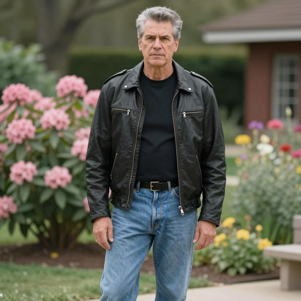 A mature man stands outdoors in a garden setting, wearing a black leather jacket paired with a black shirt and blue jeans. The background features blooming flowers and greenery, creating a natural and calm environment around him.