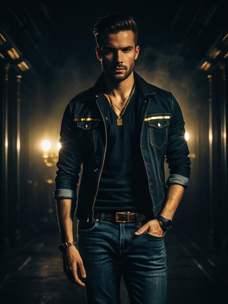 Man in Stylish Denim Jeans Outfit Waist Up Editorial Portrait Photorealist