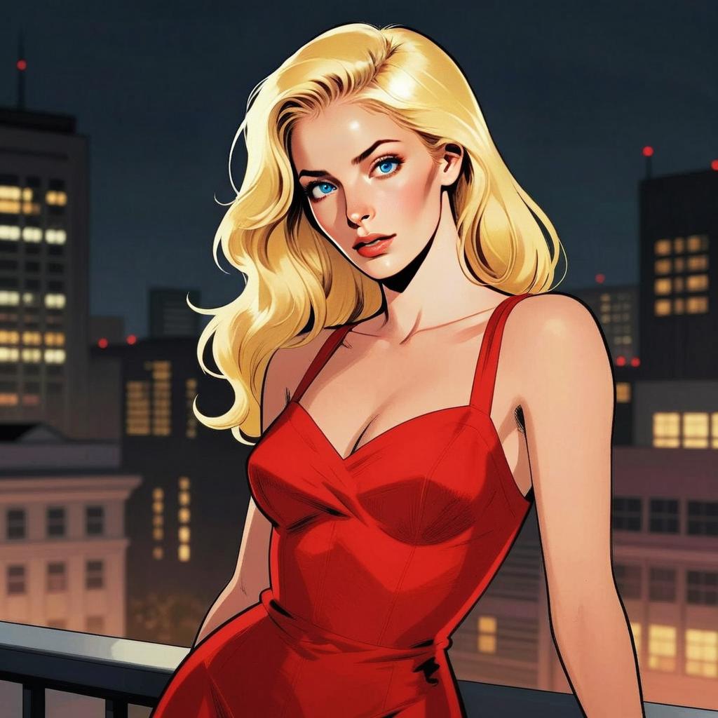 This digital artwork features a stylish blonde woman with striking blue eyes, dressed in a red evening gown, standing against a nighttime cityscape backdrop. The illustration combines smooth shading and vibrant colors, capturing a modern, elegant aesthetic with a hint of comic book style.
