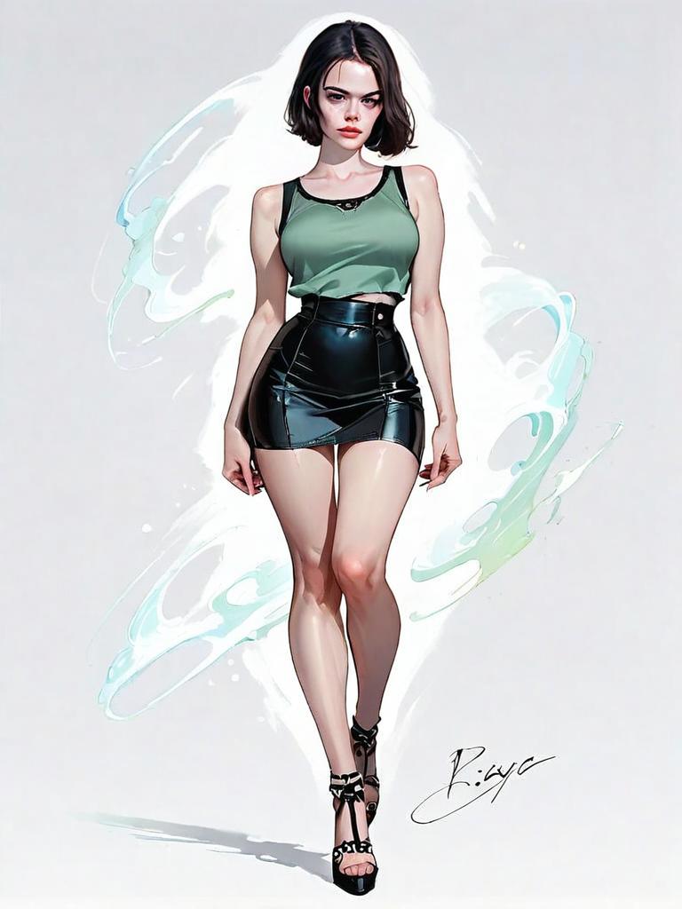 This digital artwork features a realistic full-body illustration of a confident young woman with an edgy urban style. She wears a green sleeveless top paired with a sleek black leather mini skirt and high heels, set against a minimalist background with subtle swirling abstract elements. The style blends comic realism with detailed shading and lighting to create a striking and fashionable portrait.