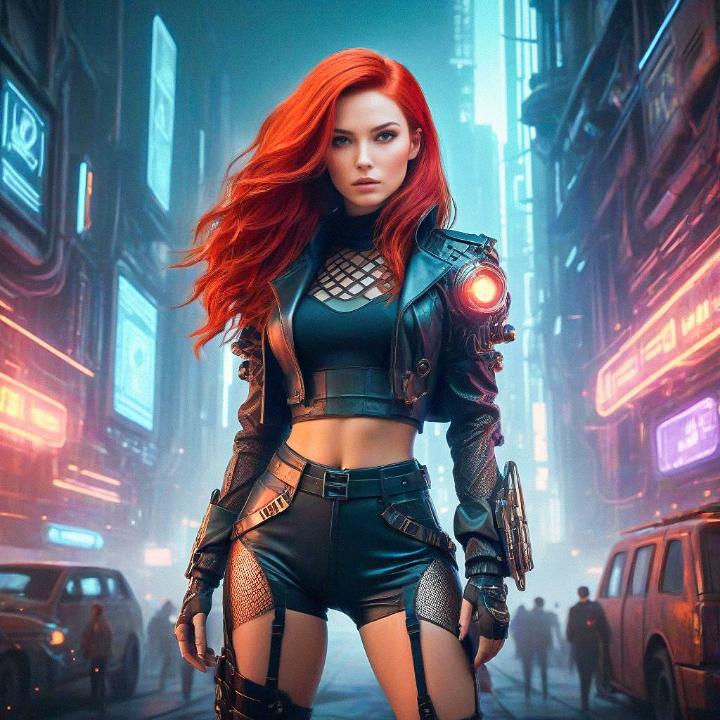 This striking digital artwork features a confident woman with vibrant red hair, set against a futuristic cityscape illuminated by neon lights. Dressed in a stylish, edgy outfit, she embodies a dynamic blend of strength and allure, reminiscent of contemporary sci-fi aesthetics.