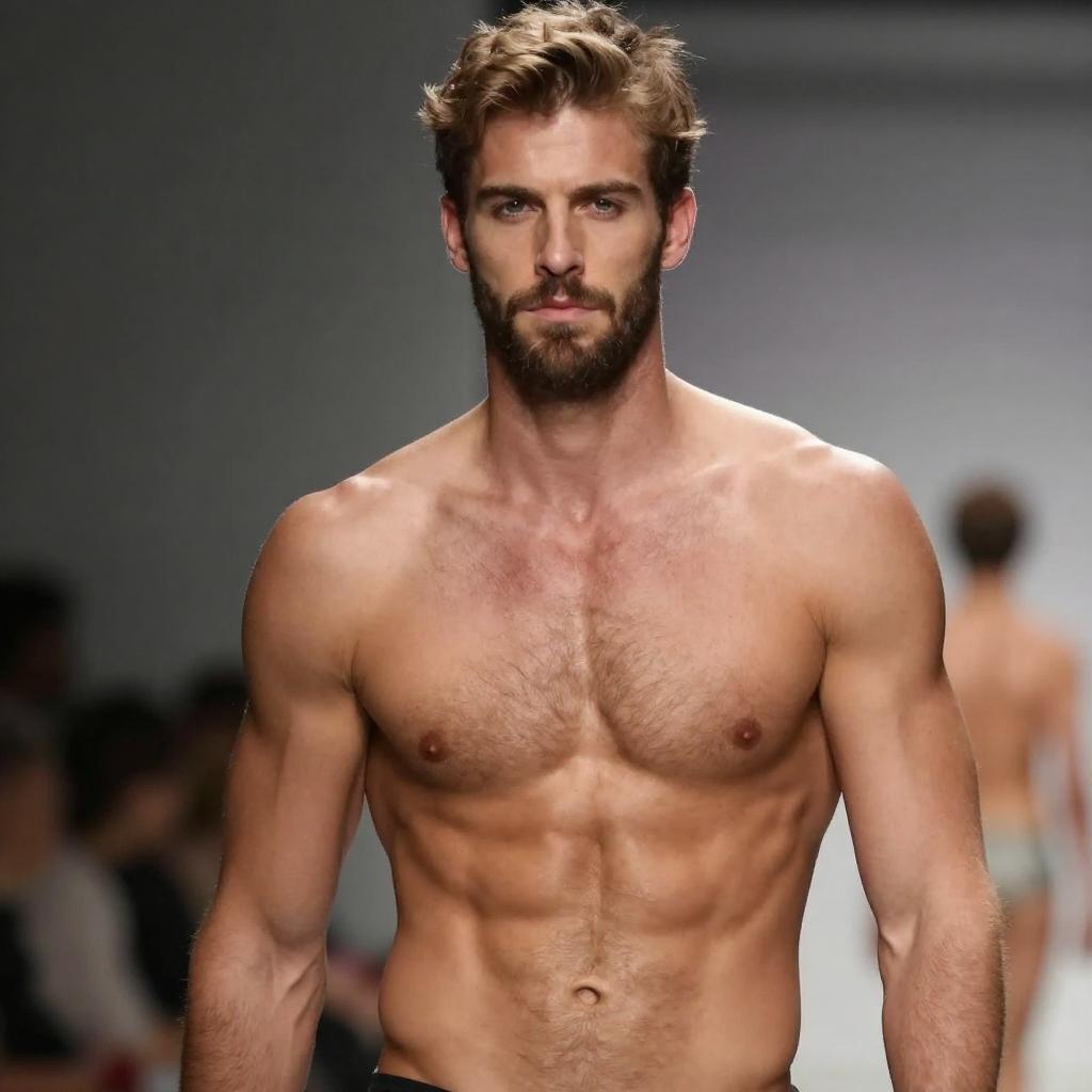 A fit, muscular man confidently walks down a runway, showcasing his toned physique and chiseled features. The image captures the essence of modern male fitness modeling with a focus on strength and natural masculinity under studio lighting in a fashion show setting.