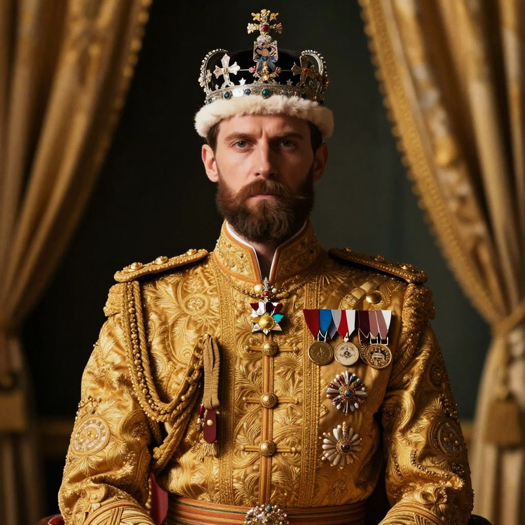 A regal man poses wearing an opulent golden royal uniform adorned with intricate embroidery and numerous medals. He is crowned with a majestic, jewel-encrusted crown, set against a backdrop of luxurious gold drapes, epitomizing classical aristocratic grandeur.