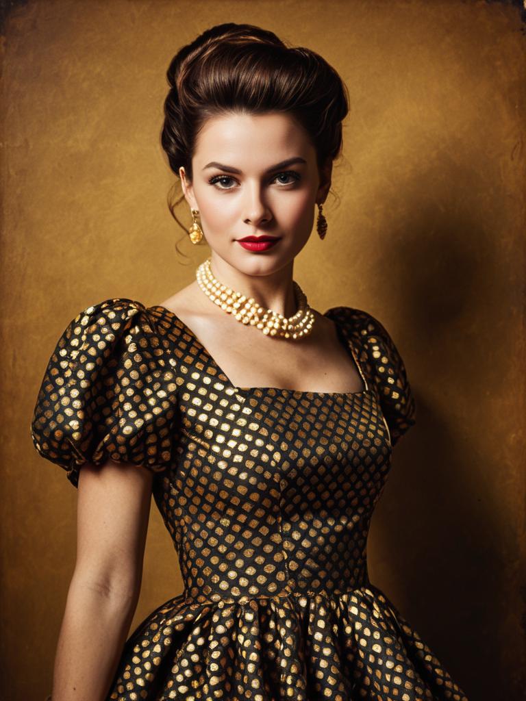 The woman is elegantly dressed in a retro-style party dress featuring puffed sleeves and a metallic gold geometric pattern on a dark fabric. Her vintage-inspired look is completed with a pearl necklace, matching earrings, and classic makeup, evoking the glamour of mid-20th century fashion.
