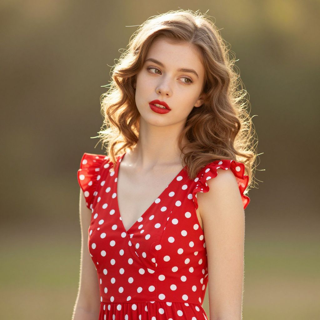 Vintage Style Woman in Red Polka Dot Dress with Retro Makeup