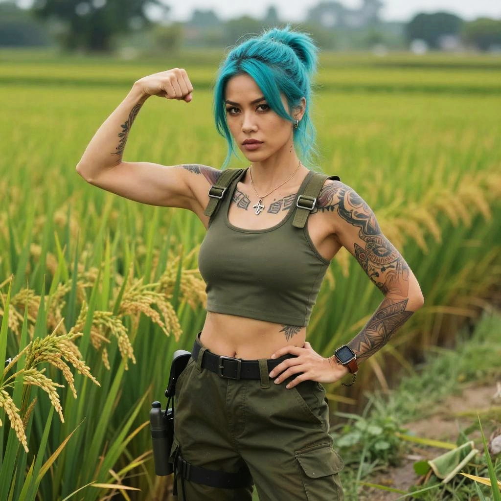 A confident young woman with vibrant blue hair and detailed tattoos poses in a green crop top and cargo pants, flexing her arm to showcase strength. She stands in a lush rice field, blending a modern, edgy style with a natural agricultural backdrop.