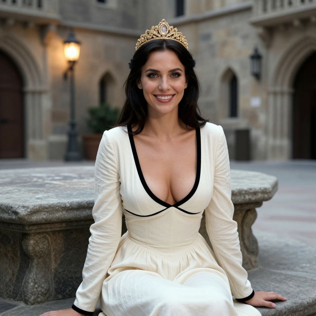 A smiling woman wearing a gold ornamental tiara and a white dress with black trim sits gracefully on a stone bench in a historic courtyard. The elegant setting features arched doorways, warm lighting, and an atmosphere evoking classical European architecture.