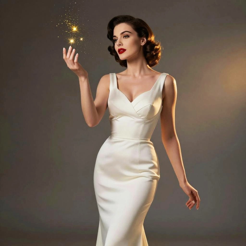 A stylish woman dressed in a sleek, white satin gown poses gracefully against a subtle gray background, evoking classic Hollywood glamour. Her vintage waves and bold red lipstick enhance the timeless elegance, while she delicately holds sparkling golden particles in her hand, adding a magical, enchanting touch to the composition.