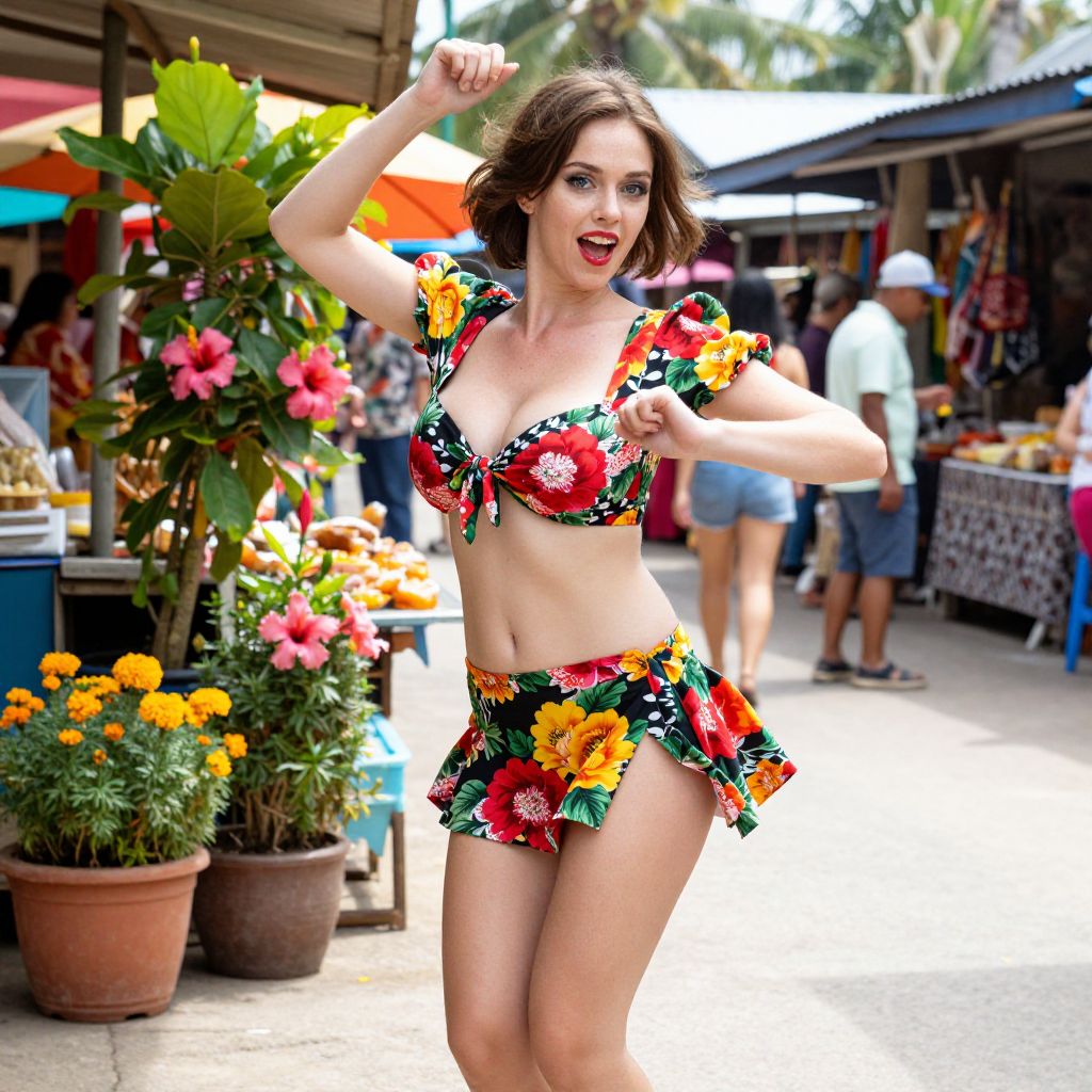 A cheerful young woman dances joyfully in a vibrant floral two-piece outfit at an outdoor market. The colorful setting, featuring tropical flowers and bustling stalls, highlights a lively and festive atmosphere. Her energetic pose and bright expression capture a moment of carefree celebration.