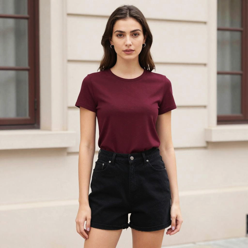 A woman stands confidently outdoors wearing a simple burgundy short-sleeve top paired with high-waisted black denim shorts. The minimalist casual outfit is complemented by her natural makeup and loose hair, set against a neutral urban background with classical architectural details.