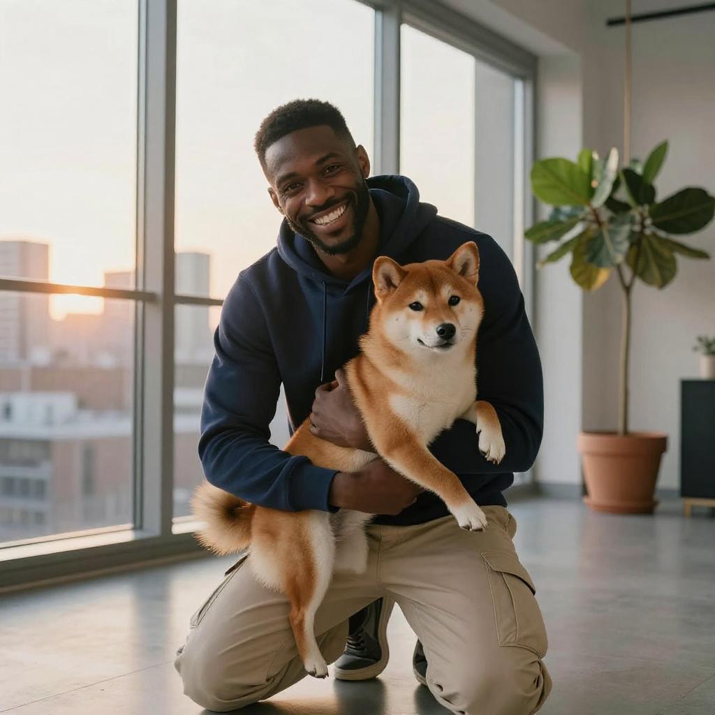 A cheerful young man wearing a navy hoodie and beige cargo pants is kneeling indoors while holding a Shiba Inu dog. The bright, modern room features large windows with city views and a potted plant, creating a warm and cozy atmosphere.