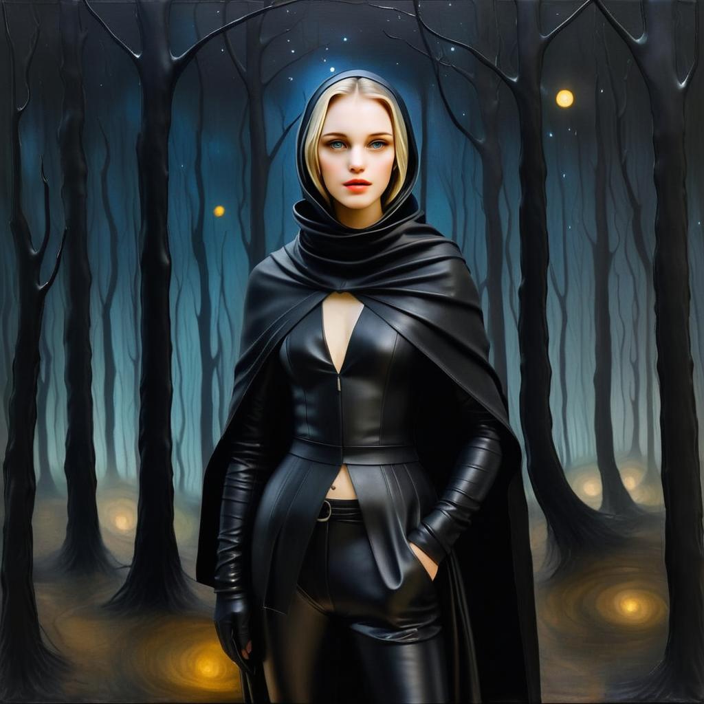 A striking woman dressed in sleek black leather attire and a matching hooded cape stands confidently in a mysterious, moonlit forest. The digital artwork blends fantasy and modern aesthetics with soft glowing orbs and an ethereal blue background, creating an enchanting yet dark atmosphere.
