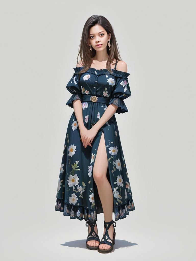 A young woman poses in a full-body shot wearing a boho chic off-the-shoulder dress adorned with a floral pattern. The dress features puff sleeves, a fitted waist with a decorative belt, and a thigh-high slit that adds an elegant flair to the overall look.