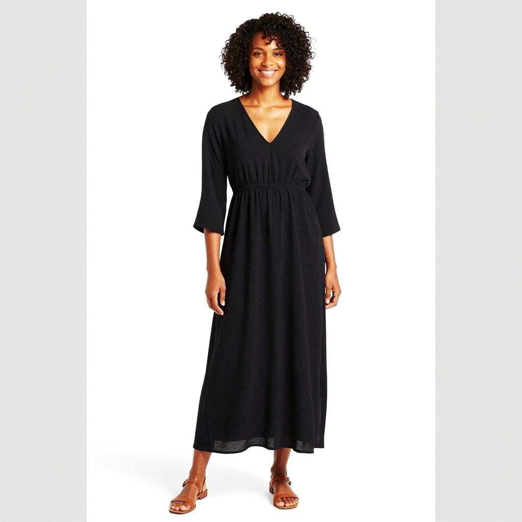 A smiling woman models a simple and elegant black maxi dress with a V-neckline and three-quarter sleeves. The dress features an elastic waist for a comfortable fit and is paired with brown flat sandals, presenting a casual yet stylish look.
