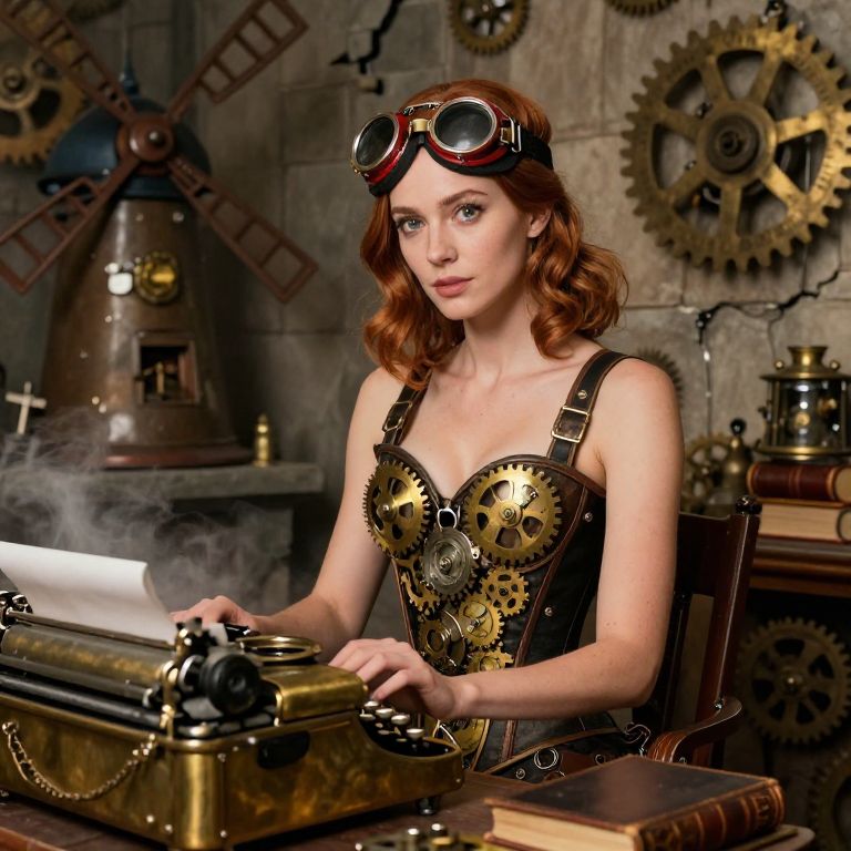 A red-haired woman dressed in a steampunk-inspired leather corset adorned with brass gears is seated at an antique brass typewriter, surrounded by industrial clockwork gears and vintage mechanical elements in the background. She wears classic steampunk goggles on her head, embodying the retro-futuristic aesthetic of the steampunk genre.
