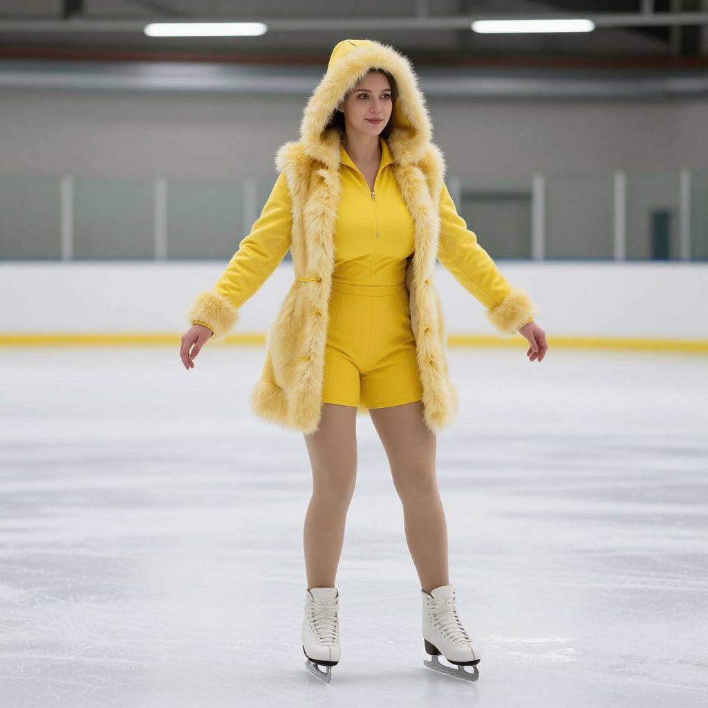 Woman Ice Skating in Vibrant Yellow Fur-Lined Coat on Indoor Ice Rink