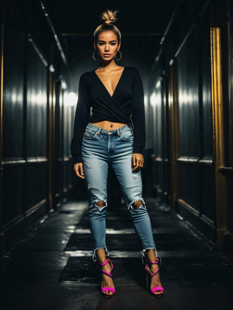 A confident woman poses in a stylish urban setting wearing a black wrap top with a deep V-neck paired with distressed light blue jeans. Her chic street style is accentuated by bold bright pink high-heeled sandals and large hoop earrings, set against a moody, dimly lit corridor backdrop.
