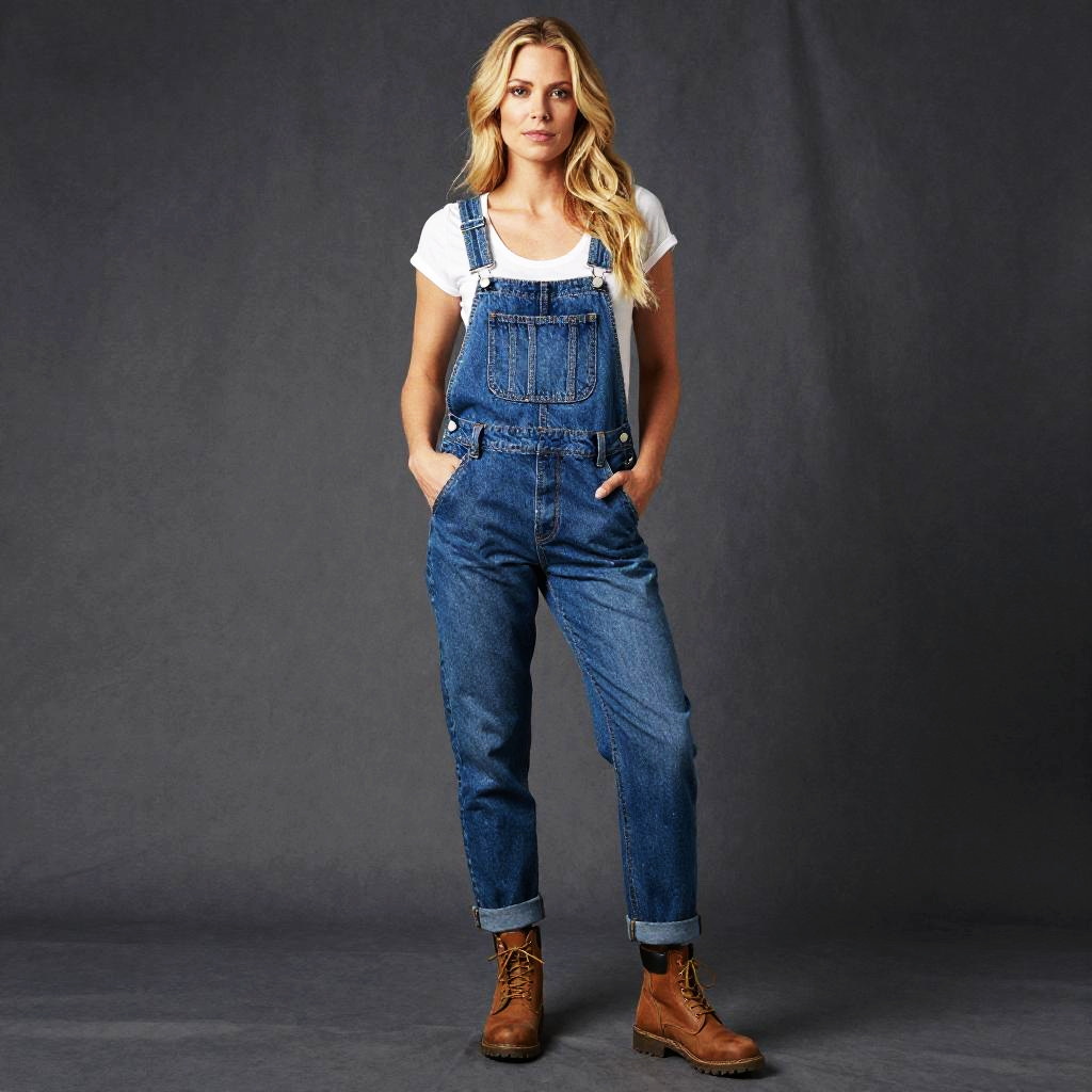A confident woman stands against a dark gray backdrop wearing a casual outfit featuring denim overalls, a white t-shirt, and brown lace-up boots. The relaxed and timeless style highlights a blend of comfort and practicality, perfect for everyday wear.