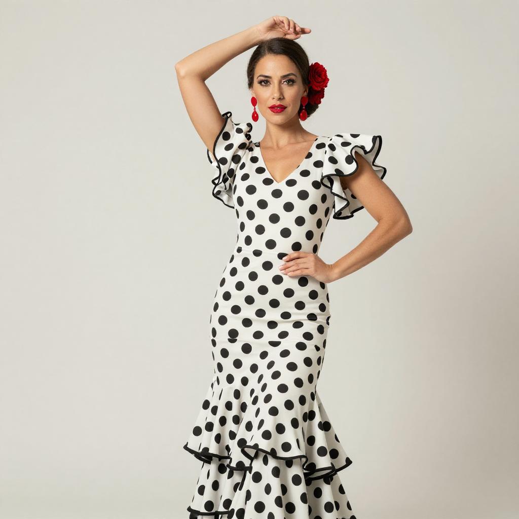 A confident woman poses in a classic flamenco-inspired dress featuring bold black polka dots on a white background. The dress is adorned with ruffled sleeves and a tiered ruffle skirt, complemented by vibrant red earrings and a matching red flower in her hair, evoking traditional Spanish style.