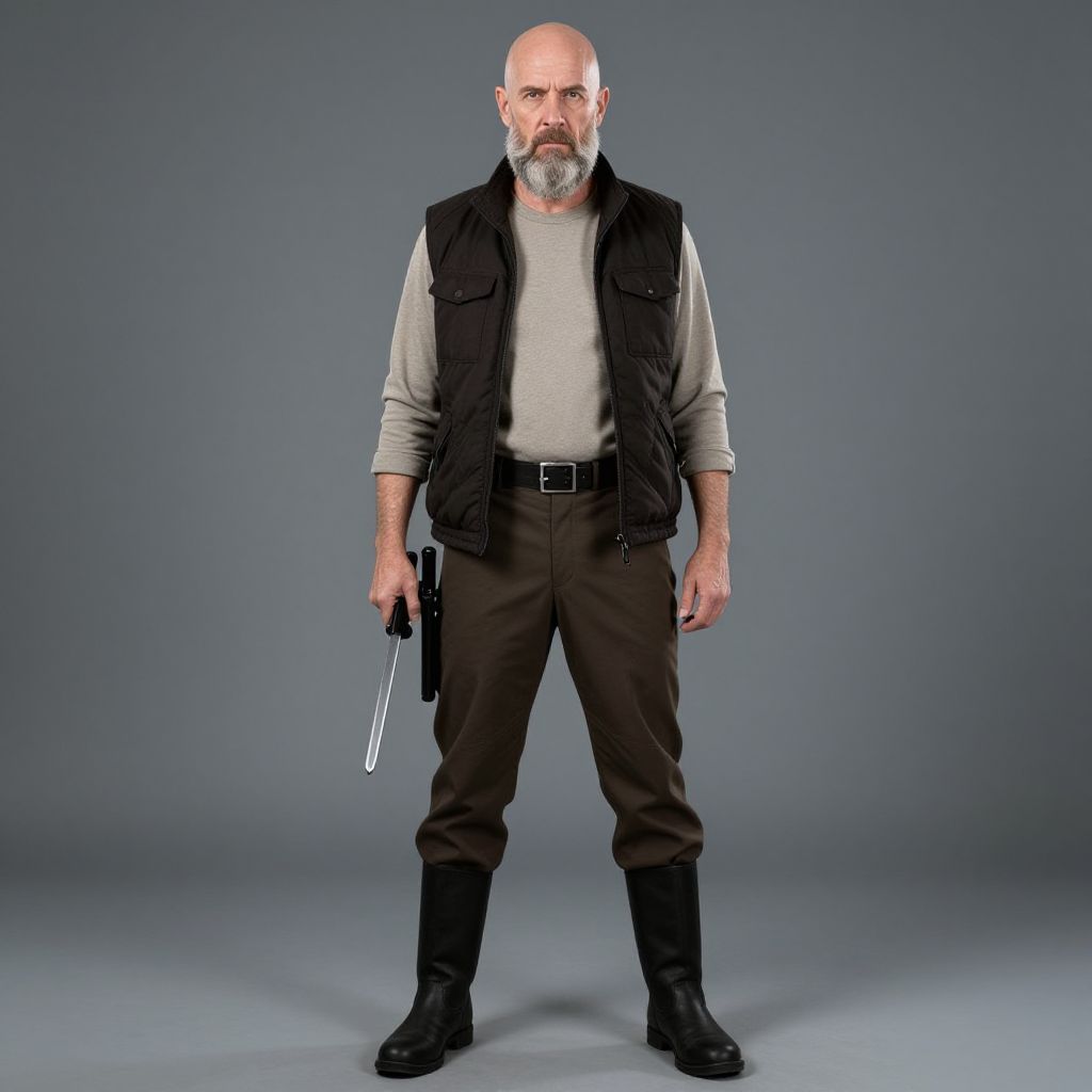 A stern older man with a gray beard stands confidently against a plain gray background, holding a long knife in his right hand. He is dressed in outdoor attire, featuring a brown vest, beige long-sleeve shirt, and brown pants tucked into black boots, embodying a rugged, survivalist style.