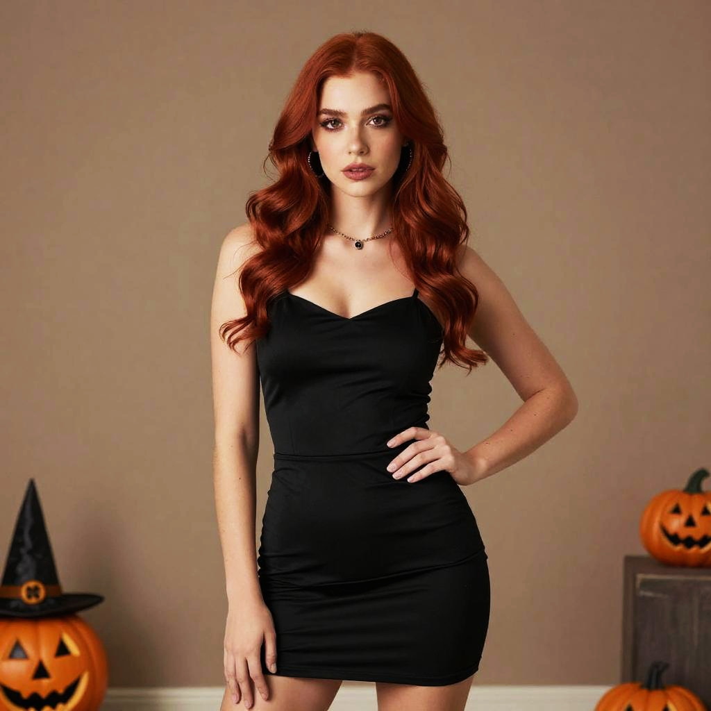 A woman with long, wavy red hair poses confidently in a sleek black dress, embodying a modern Halloween style. The warm-toned background is accented with carved pumpkin decorations, adding a festive and seasonal touch to the elegant portrait.