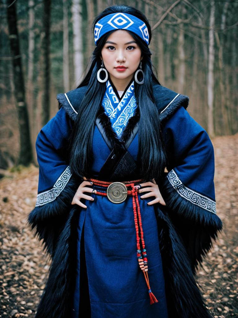 Ainu Inspired Traditional Woman in Blue Robe with Headband in Forest
