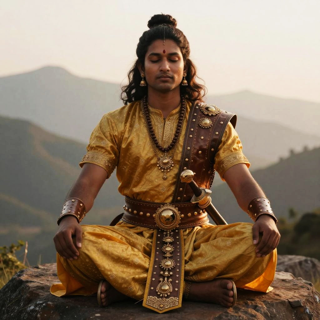 A man dressed in golden traditional warrior attire meditates peacefully on a rock with serene mountain hills in the background. His outfit features ornate jewelry, a decorative sword belt, and intricate detailing, reflecting a historical or mythological style.