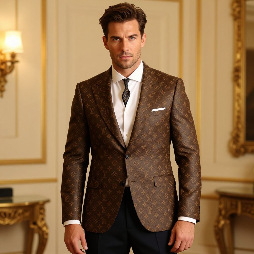 A confident man models a luxurious brown patterned blazer with a white dress shirt and black tie in an elegant room featuring ornate golden furniture and classic wall decor. The blazer’s intricate monogram design adds a sophisticated and stylish touch, highlighting high fashion and timeless elegance.