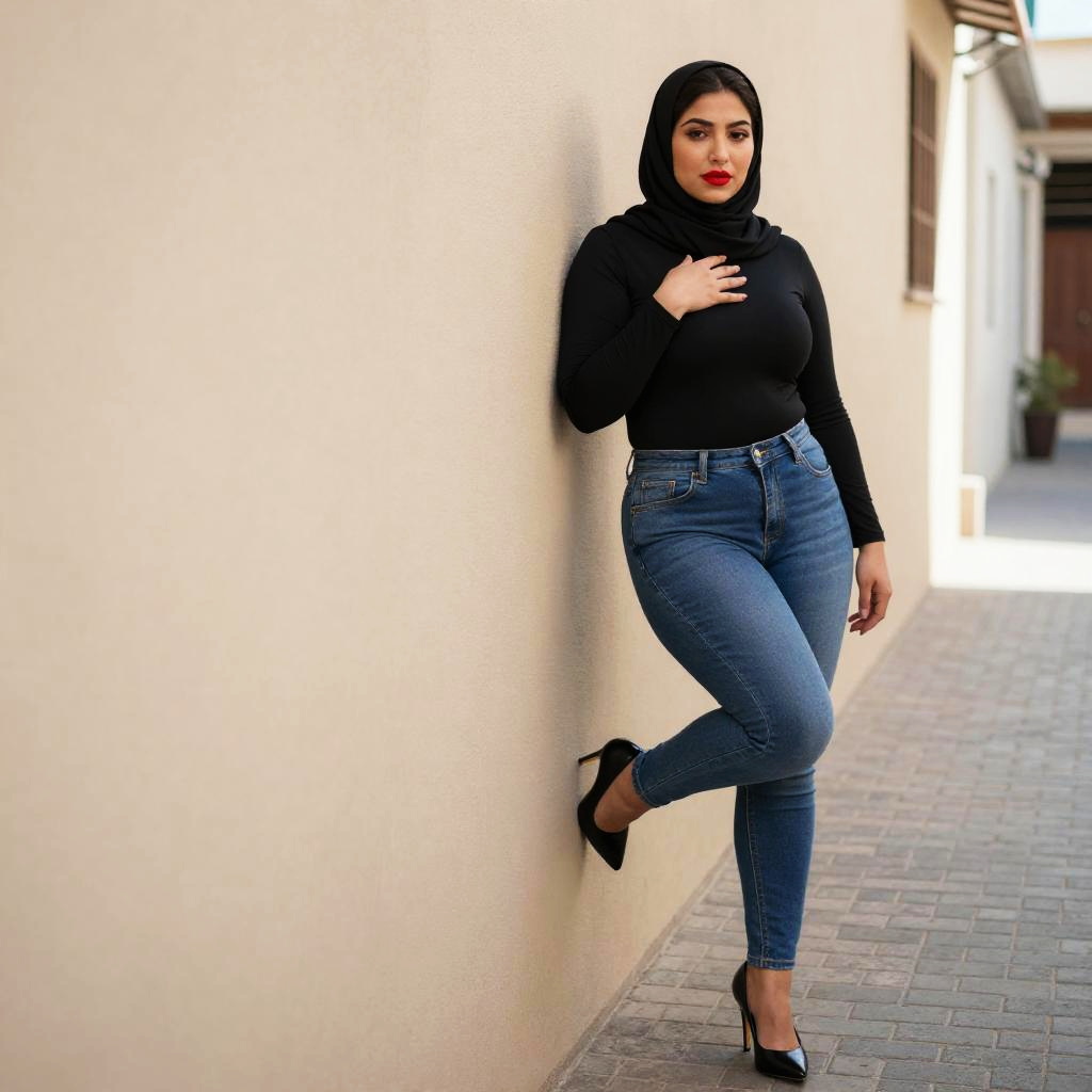 A confident woman wearing a black hijab and a fitted black top pairs it with blue skinny jeans and black high heels, leaning casually against a beige wall. She exudes a modern and modest fashion style with a bold red lip, set against a neutral, urban background.