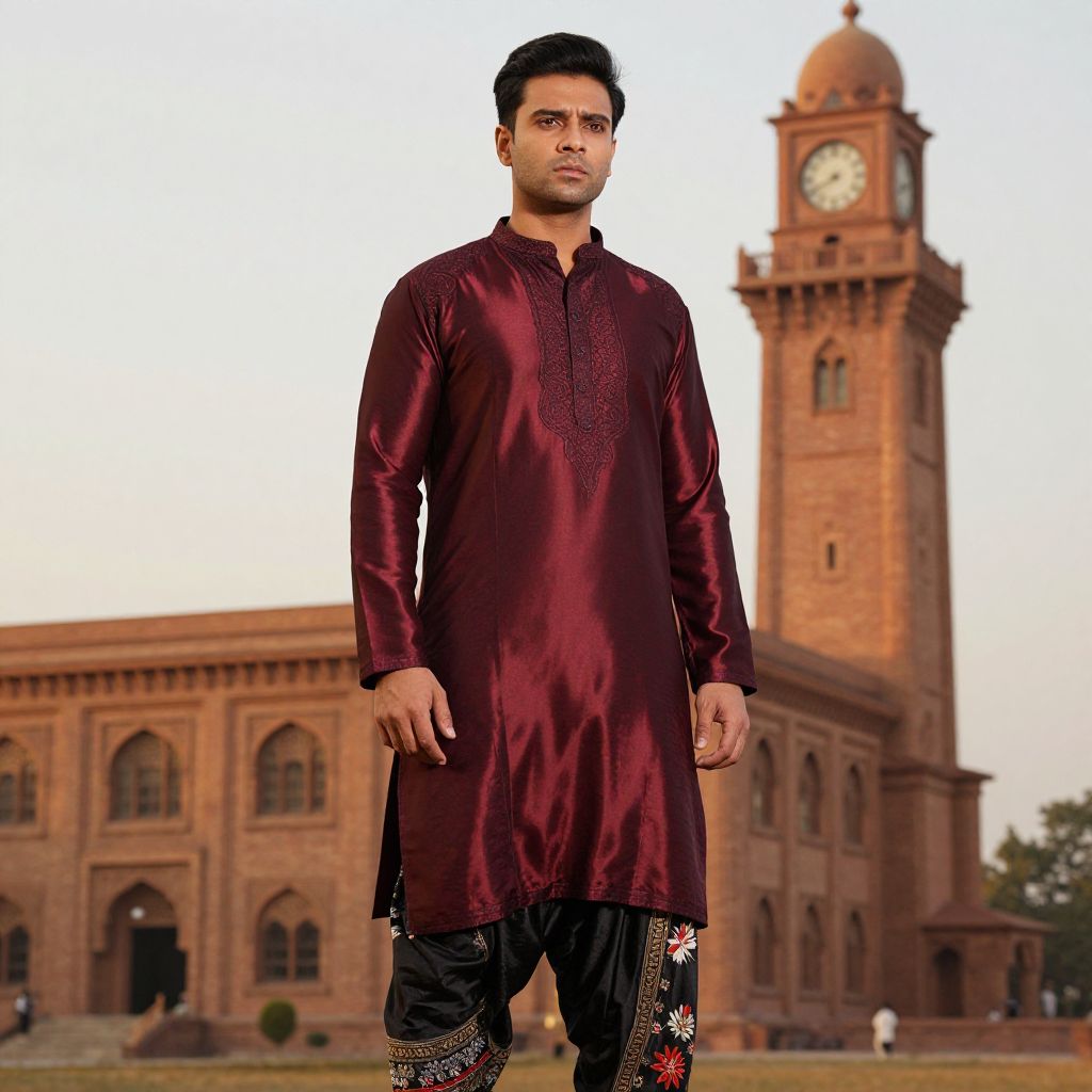 Man in Traditional Maroon Kurta and Embroidered Shalwar by Historic Clock Tower