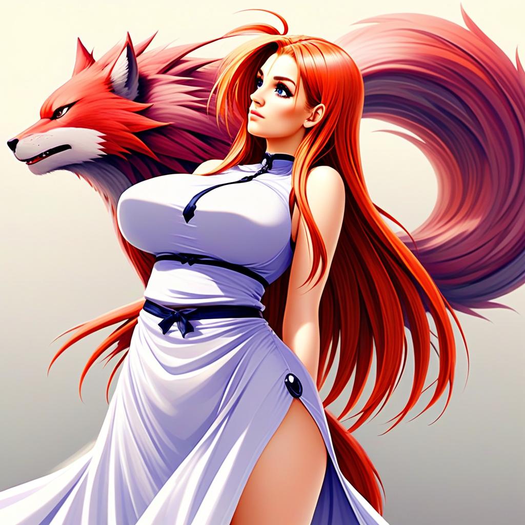 Anime Style Red-Haired Woman with Majestic Fox Illustration