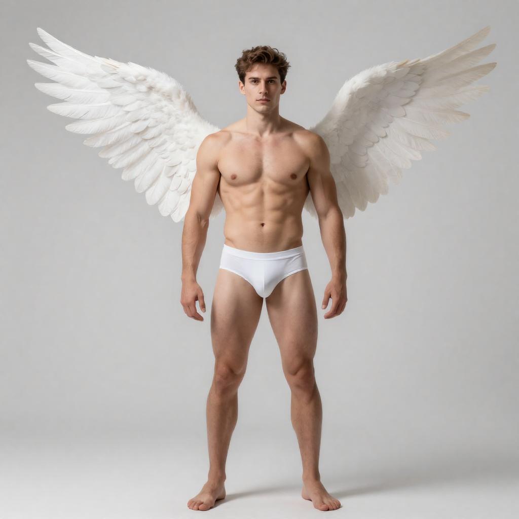 A muscular young man stands confidently wearing only white briefs, with large, realistic white angel wings extending from his back. The minimalistic background and soft lighting emphasize his toned physique and the ethereal quality of the wings, creating a striking and symbolic image.