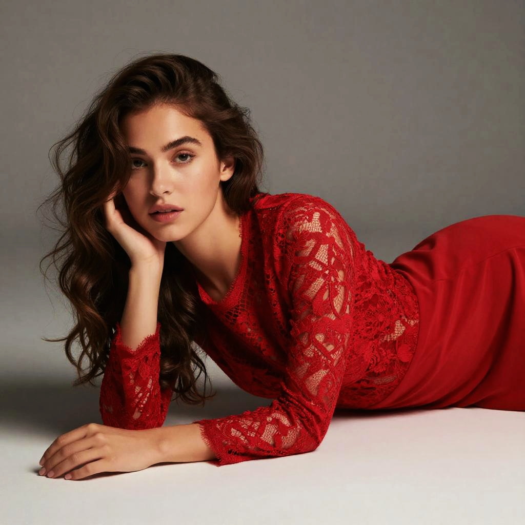 A young woman lies elegantly on her side, wearing a vibrant red lace dress that complements her wavy brunette hair and natural makeup. The minimalist gray background emphasizes the intricate floral patterns of the lace, creating a sophisticated and stylish portrait.