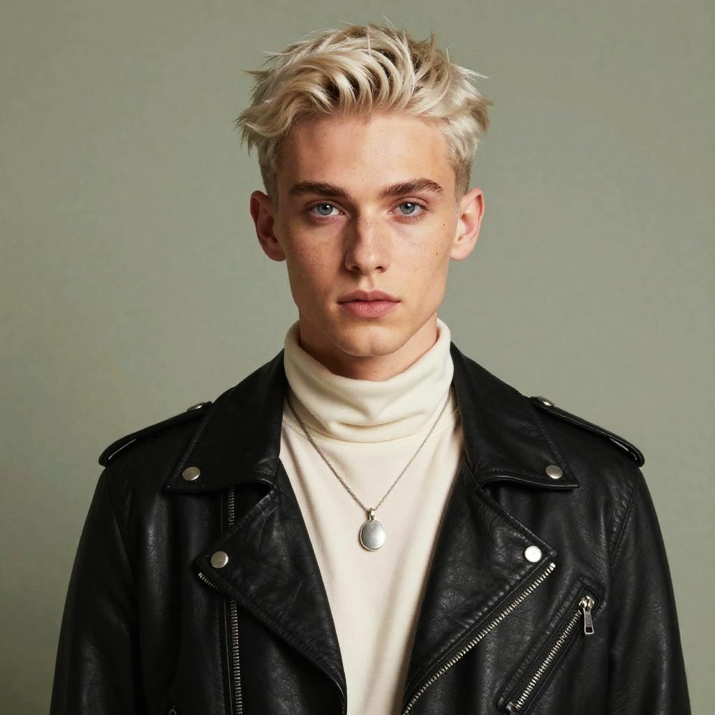 A young man with platinum blonde hair and piercing blue eyes models a modern Gen Z style. He wears a black leather jacket over a cream turtleneck, accessorized with a silver pendant necklace, against a muted background.