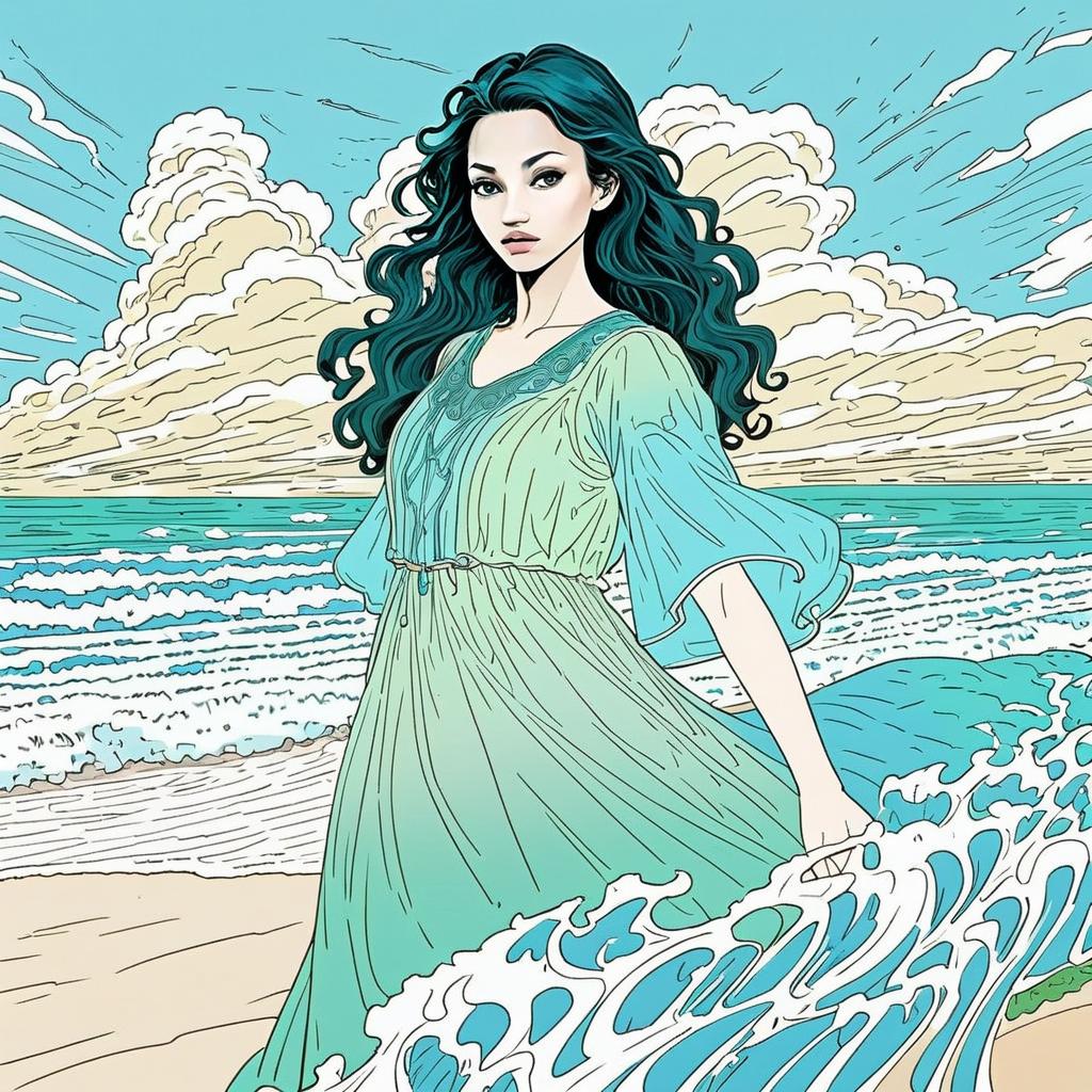 This digital illustration features a woman with flowing dark hair standing at the edge of the ocean, her dress blending harmoniously with the sea waves. Rendered in a detailed anime style, the artwork captures a serene and contemplative atmosphere with a vibrant yet soft color palette.