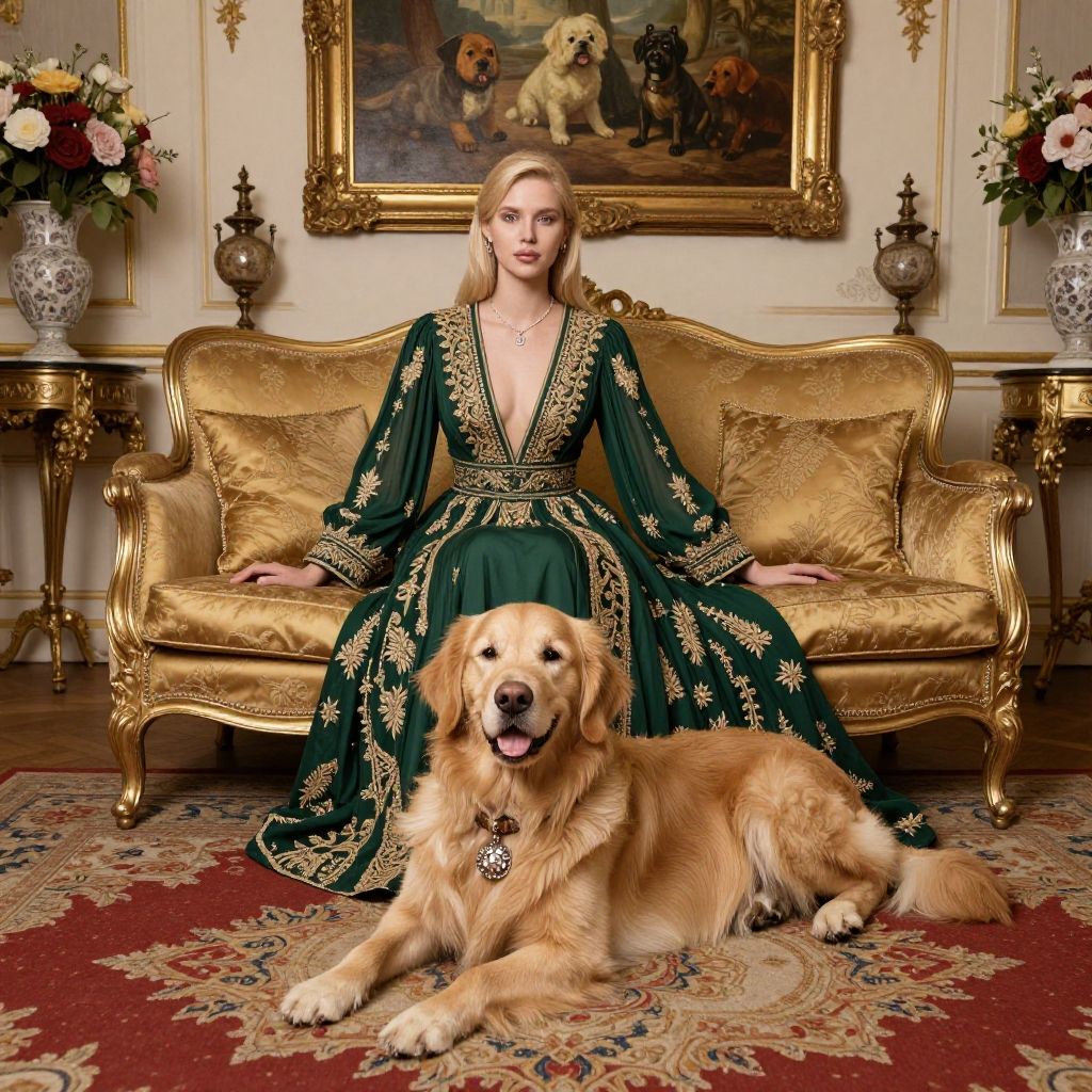 A woman dressed in an elegant green and gold embroidered gown sits regally on a luxurious gold-upholstered sofa in a richly decorated room, accompanied by a relaxed golden retriever lying on an ornate patterned carpet. The setting features classical elements including a floral arrangement, gilded furniture, and a painting of dogs in the background, creating a sophisticated, royal atmosphere.