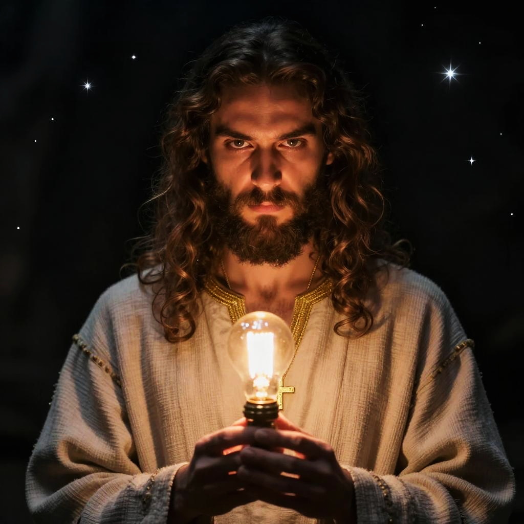 A man with long curly hair and a beard, dressed in a traditional robe with gold embroidery, holds a glowing light bulb in his hands against a dark, starry background. His intense gaze and the soft illumination from the bulb create a mystical and contemplative atmosphere.
