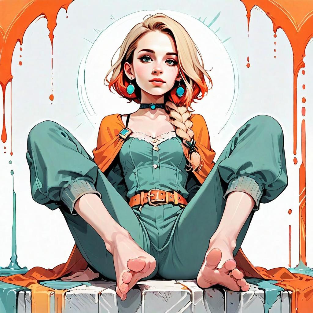 A stylized digital artwork features a confident young woman seated with her legs spread in a relaxed pose. She wears a teal belted jumpsuit with an orange jacket draped over her shoulders, and her hair is styled in a loose braid with striking orange highlights. The vivid colors and dynamic composition give the image a modern anime-inspired aesthetic with detailed shading and a vibrant, creative background.