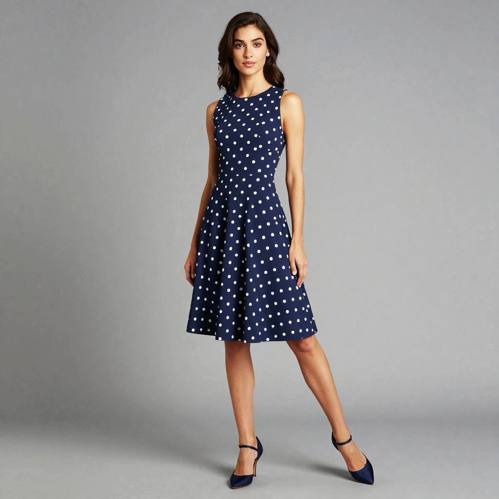 A woman poses confidently wearing a vintage-inspired navy blue polka dot dress with a fitted bodice and flared skirt, embodying a classic 1950s style. The sleeveless design and subtle white dots create a timeless, elegant look perfect for various semi-formal occasions.