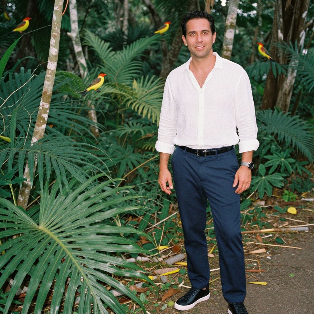 A man stands confidently on a forest path surrounded by lush tropical foliage and several vividly colored yellow and red birds perched nearby. He is dressed in a casual yet stylish outfit, featuring a white button-up shirt and navy blue pants, captured in natural outdoor light.
