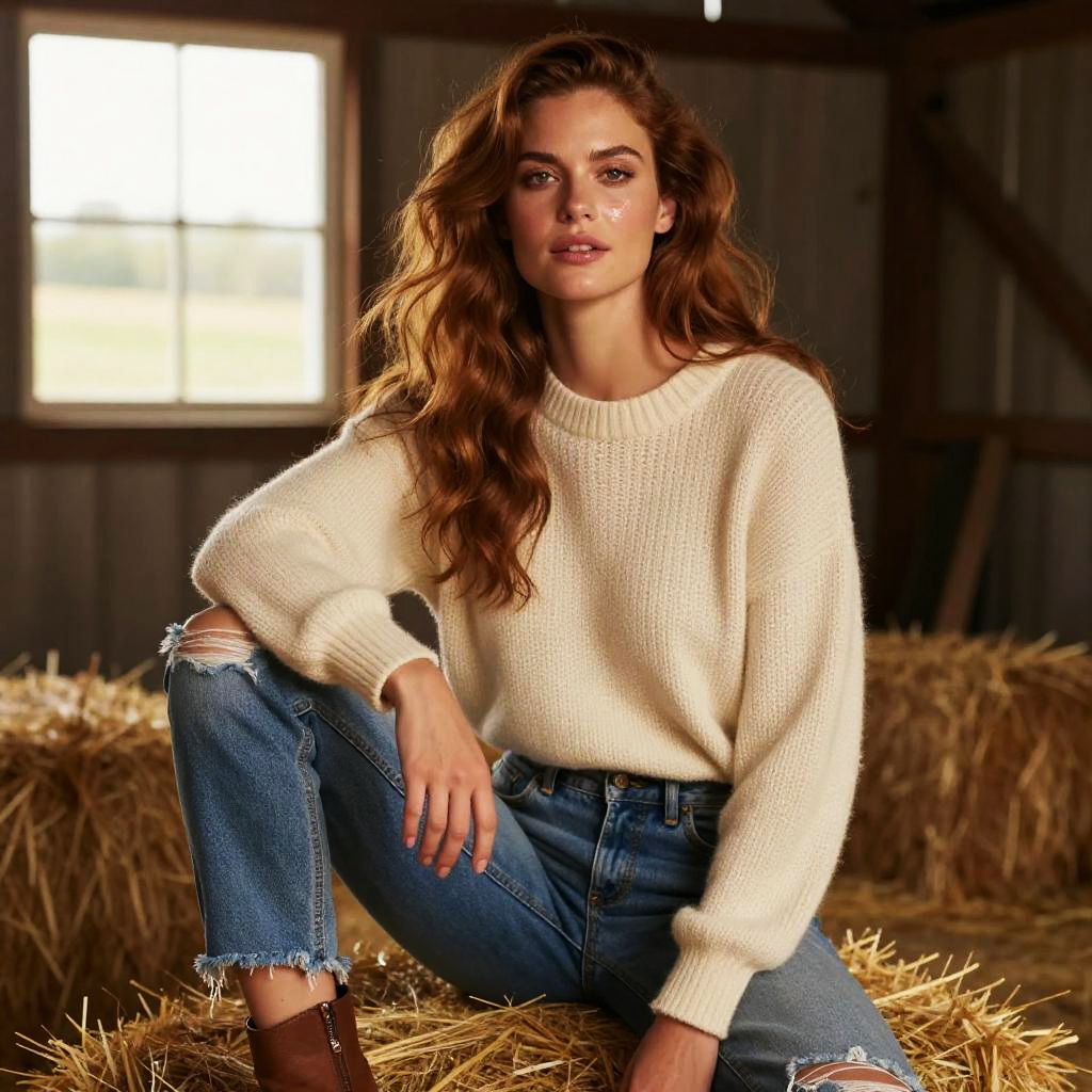 A young woman with long wavy red hair sits comfortably on a pile of hay inside a rustic barn. She is dressed in a cozy cream-colored knit sweater and ripped blue jeans, embracing a natural, laid-back style with soft natural lighting highlighting her features.
